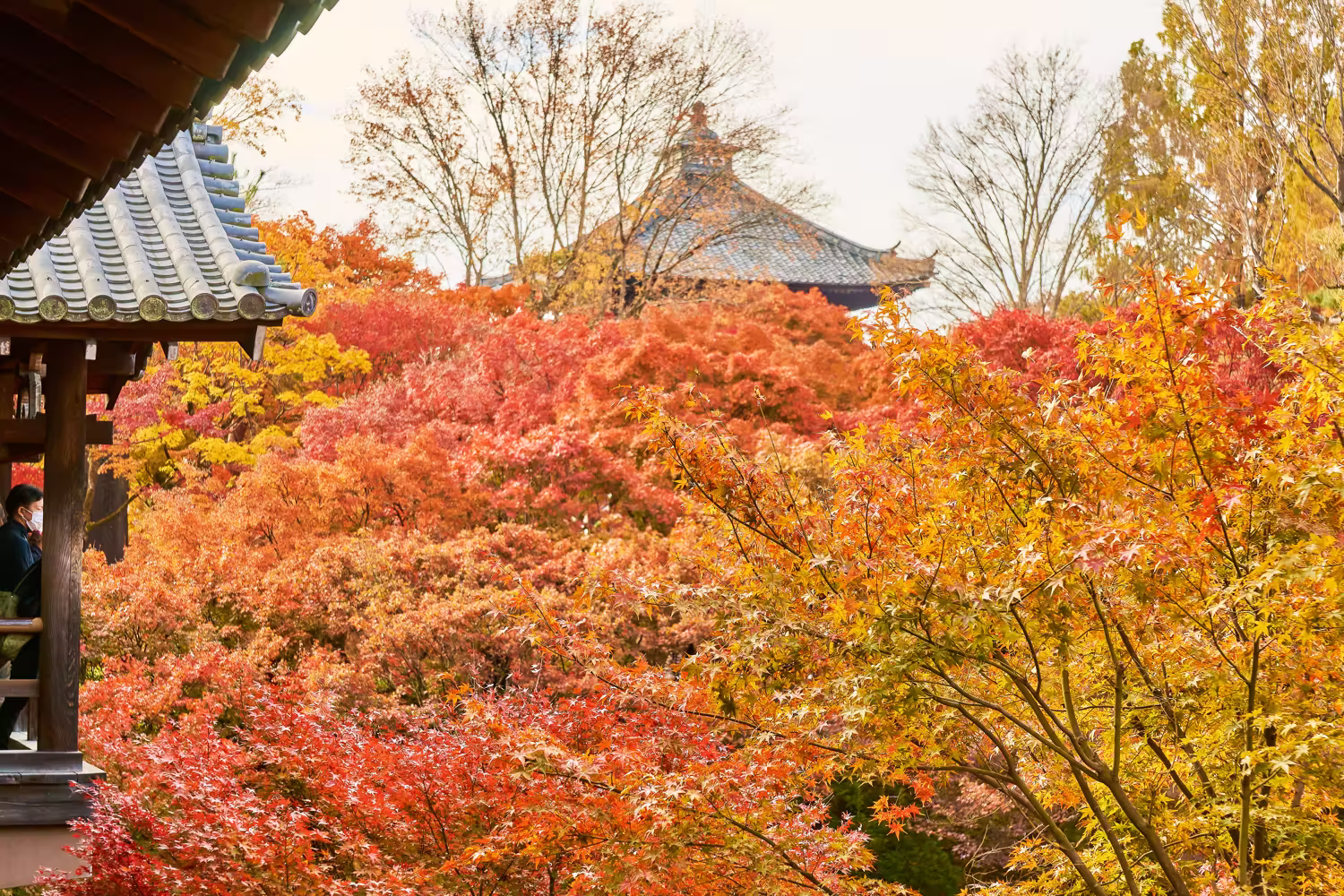 From Tofuku-ji’s iconic Tsutenkyo Bridge, visitors can look down into a valley completely filled with vibrant autumn maples. In autumn, the entire landscape transforms into waves of red, orange, and gold.