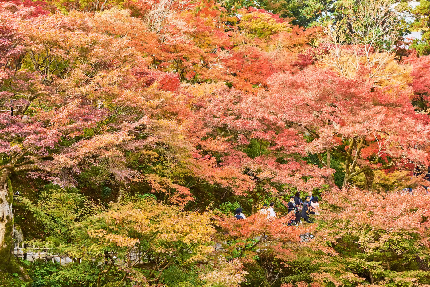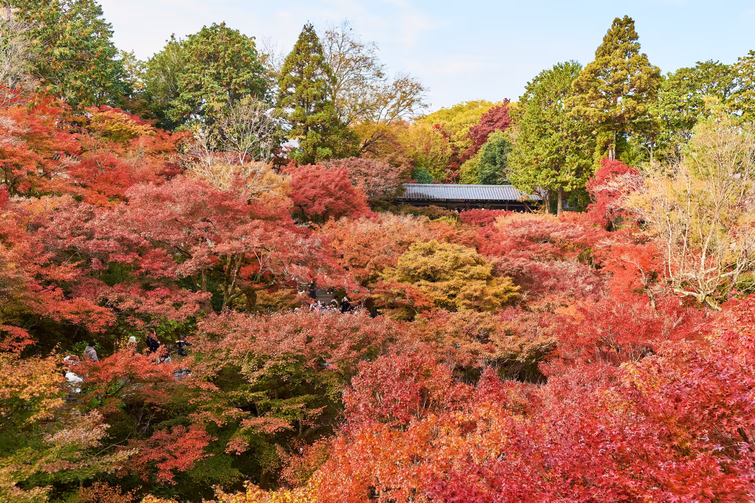 Looking down from Tsutenkyo Bridge reveals visitors walking along a path completely surrounded by colorful autumn leaves. Layers of red, orange, and soft yellow maples create the impression of a natural “tunnel of foliage.” The depth and vibrancy seen here beautifully reflect the unique landscape of Tofuku-ji’s maple valley.