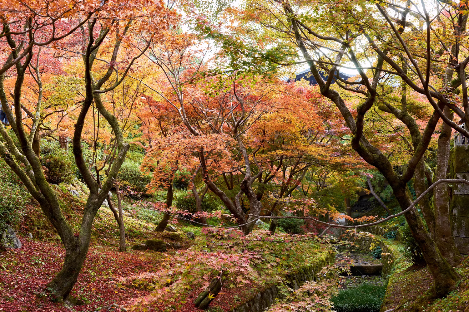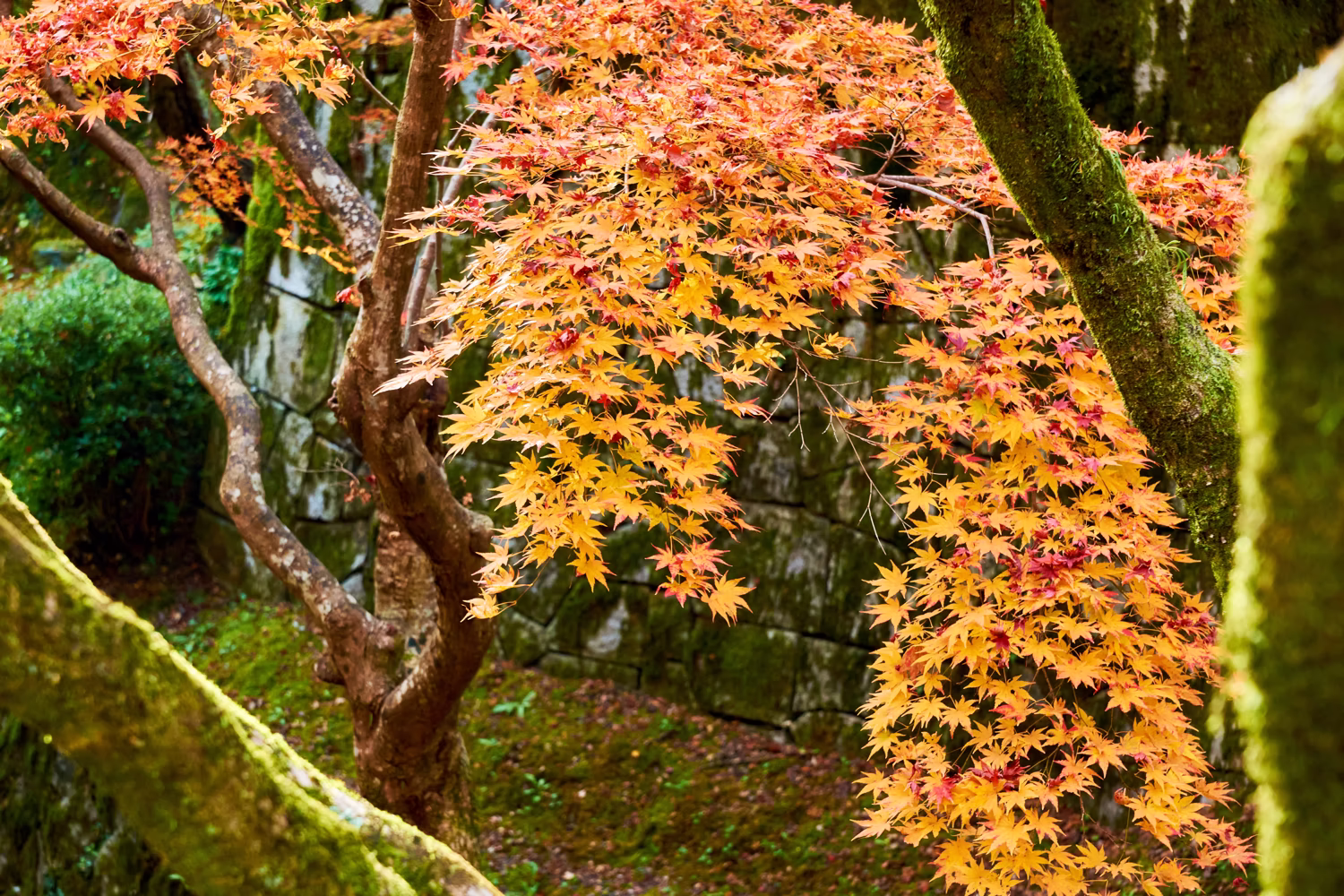 Sengyokukan is a natural ravine running through the center of Tofuku-ji Temple, shaped over centuries by the flow of the Sannobashi River. During autumn, the moss-covered rocks and native forest transform into a brilliant landscape of red and gold maples. Unlike the busy viewpoints around Tsutenkyo Bridge, Sengyokukan offers a quieter atmosphere where visitors can appreciate the untouched beauty of Kyoto’s natural scenery.