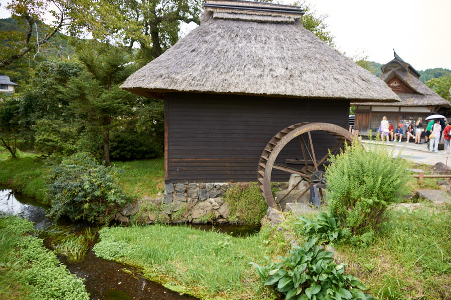 The scene of a watermill and thatched roofs