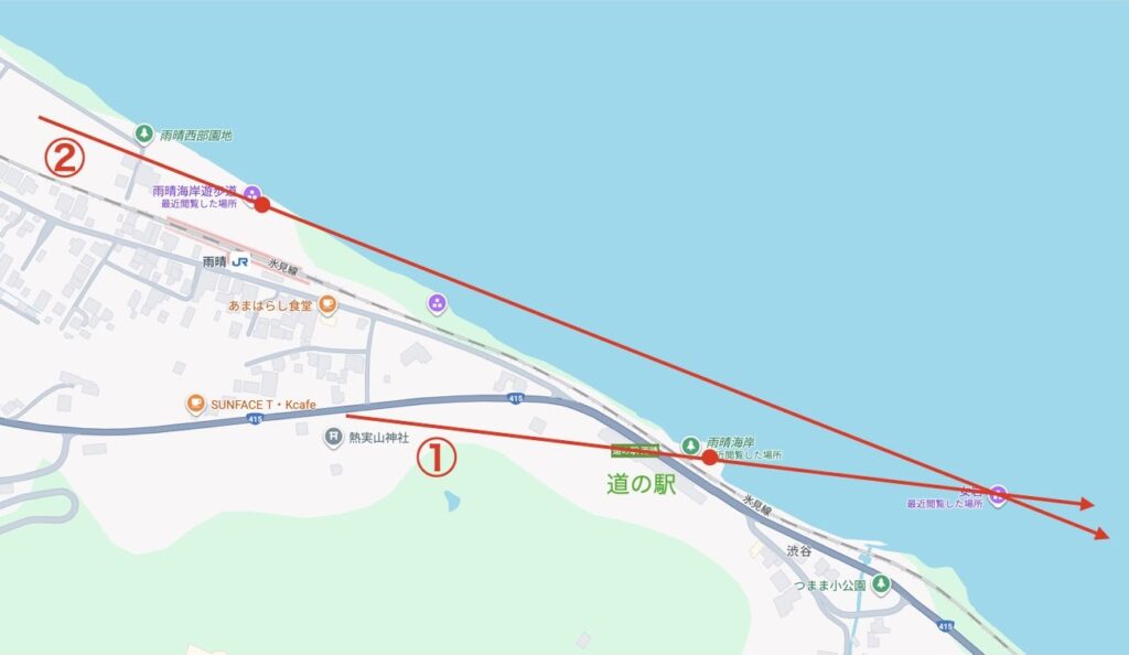 To frame Mount Tsurugi (note the summit is offset to the right) in the background, you must move down to the coast near JR Amahare Station (refer to Fig. 1, Fig. 2, and ②). Only then, by using a telephoto lens to pull in Onna-iwa Rock, can you achieve the “Mount Tsurugi + Onna-iwa Rock” composition. A telephoto lens around 200-300mm is ideal, and a tripod is essential for a stable composition.