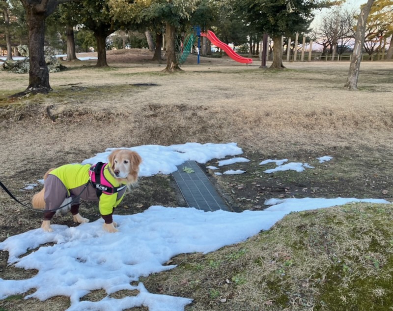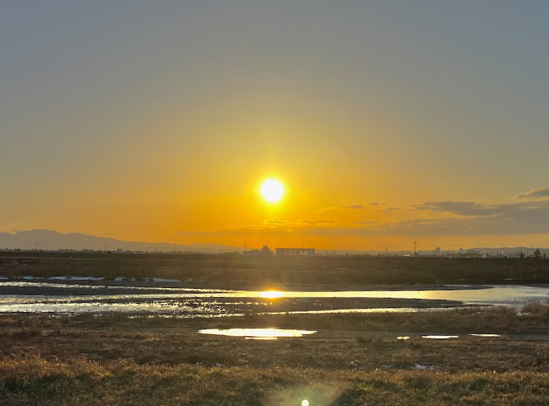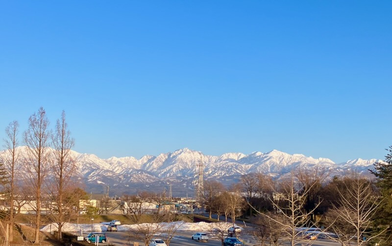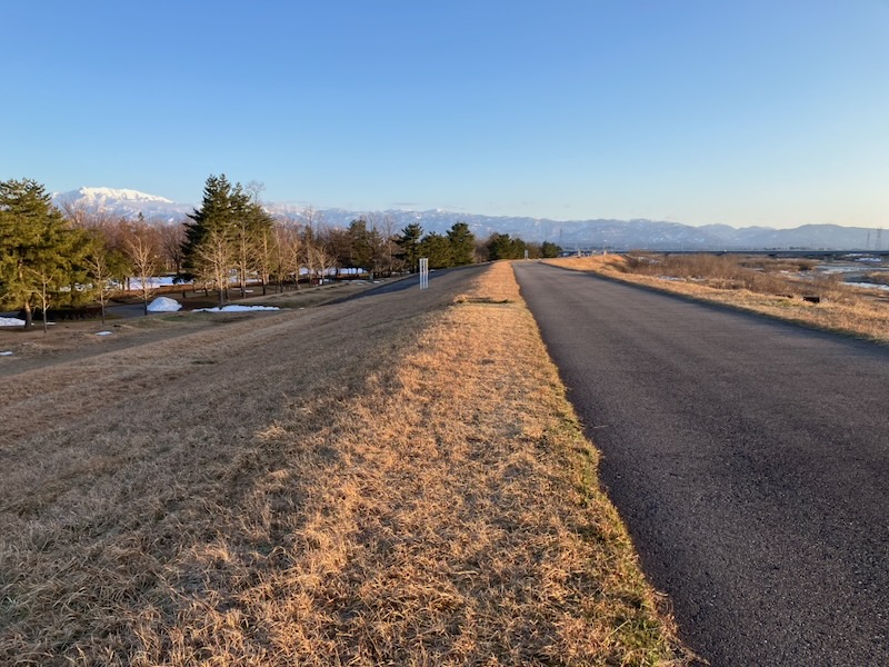 Until last week Toyama experienced heavy snowfall, and some snow still remained when I visited the park with my dog. Although the air was cold, the gentle winter sunlight felt warm, and the crisp atmosphere made the walk especially refreshing. Climbing up to the embankment, we were rewarded with a clear view of Mt. Tsurugi before sunset, sharply outlined in the transparent winter air. Looking toward the opposite side, the cityscape of Toyama spreads out beyond the river, allowing you to enjoy both the mountain scenery and urban view from a single location.